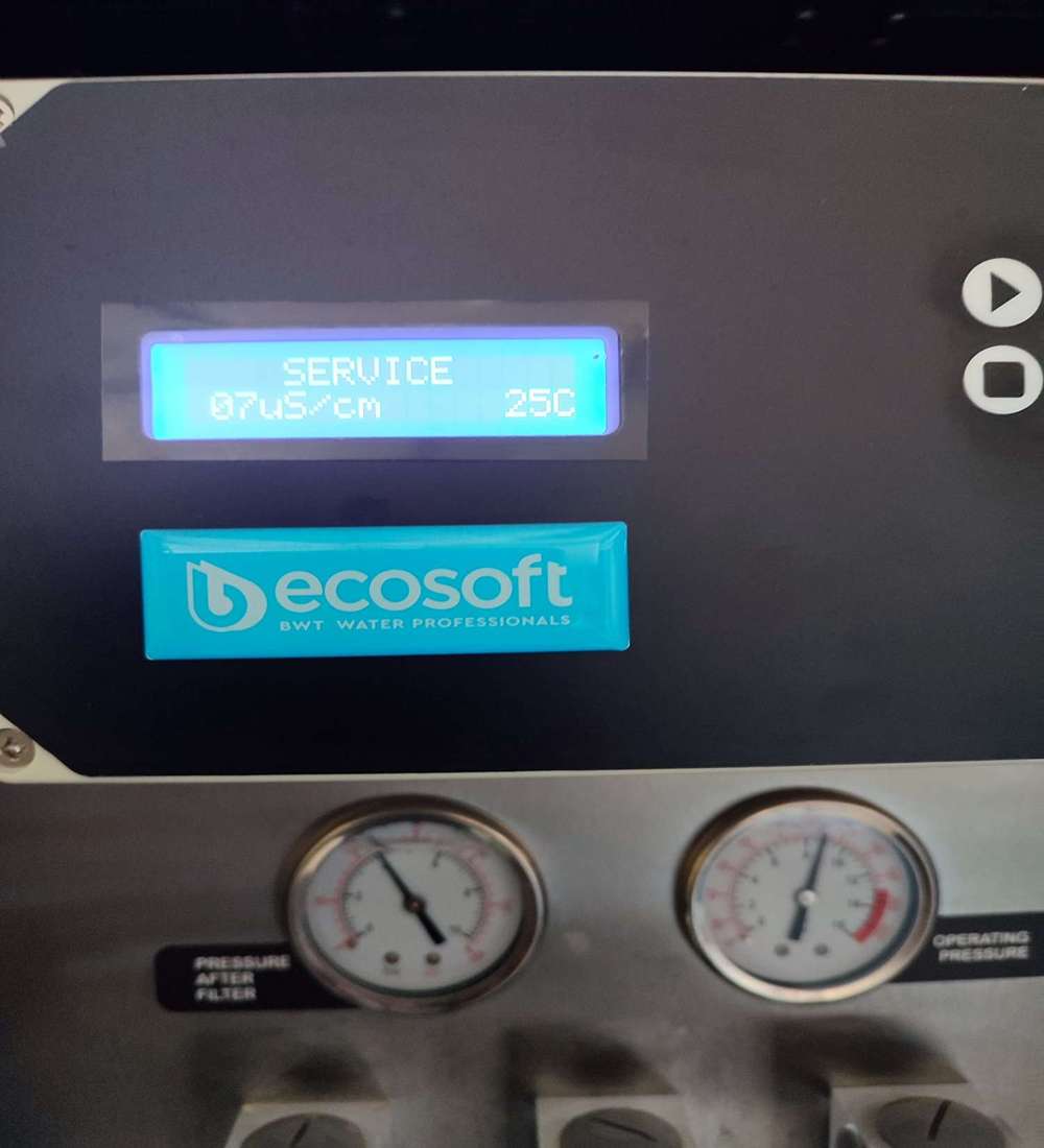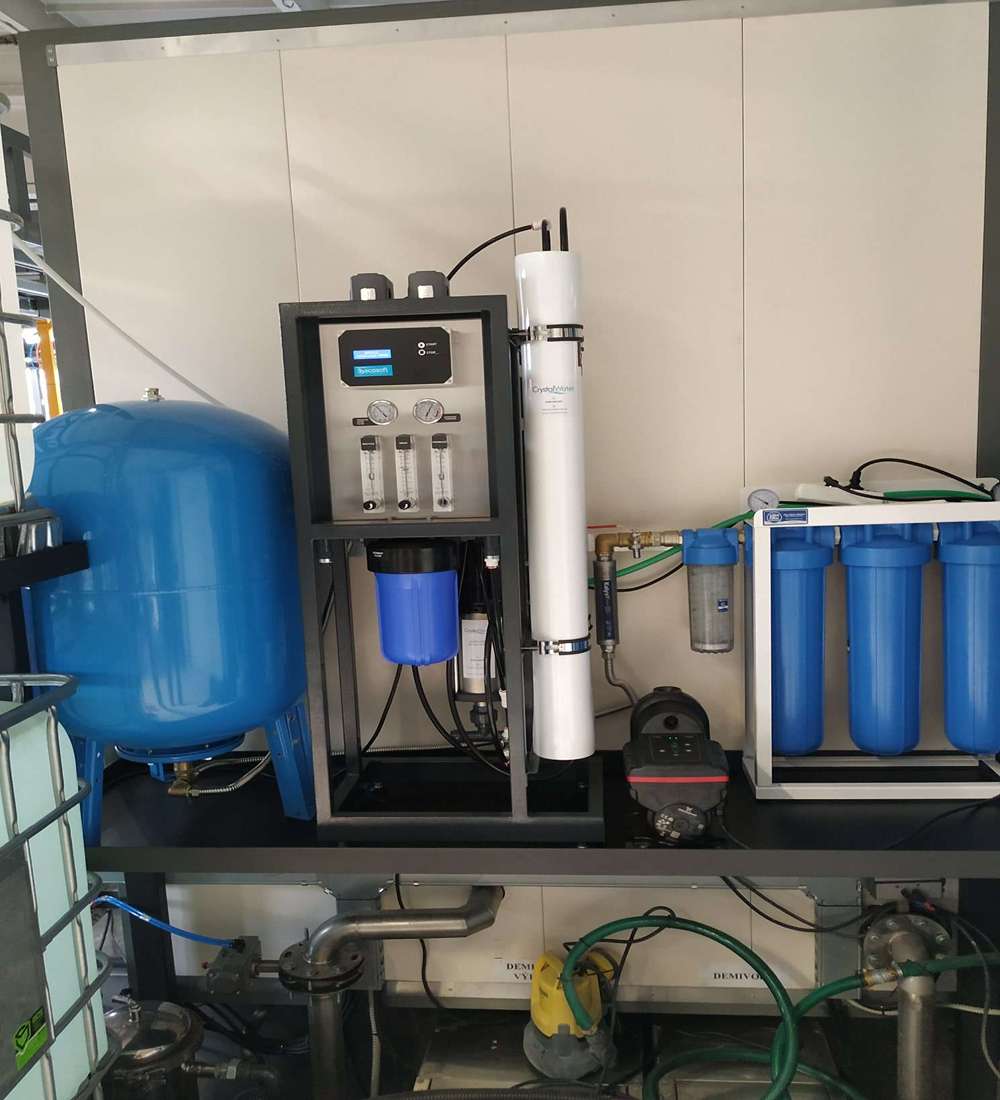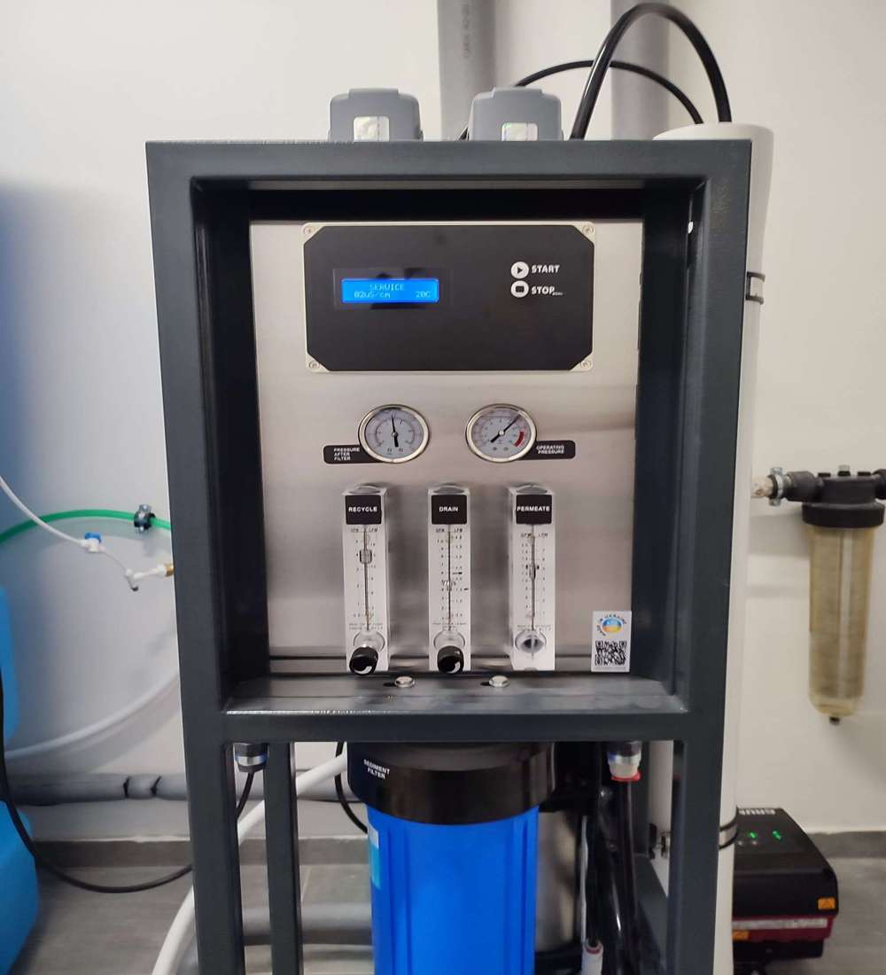 Profesionální ultra výkonná reverzní osmóza. Zařízení produkuje nízkomineralizovanou vodu s vodivostí pod 2 % původní vodivosti vstupní vody.