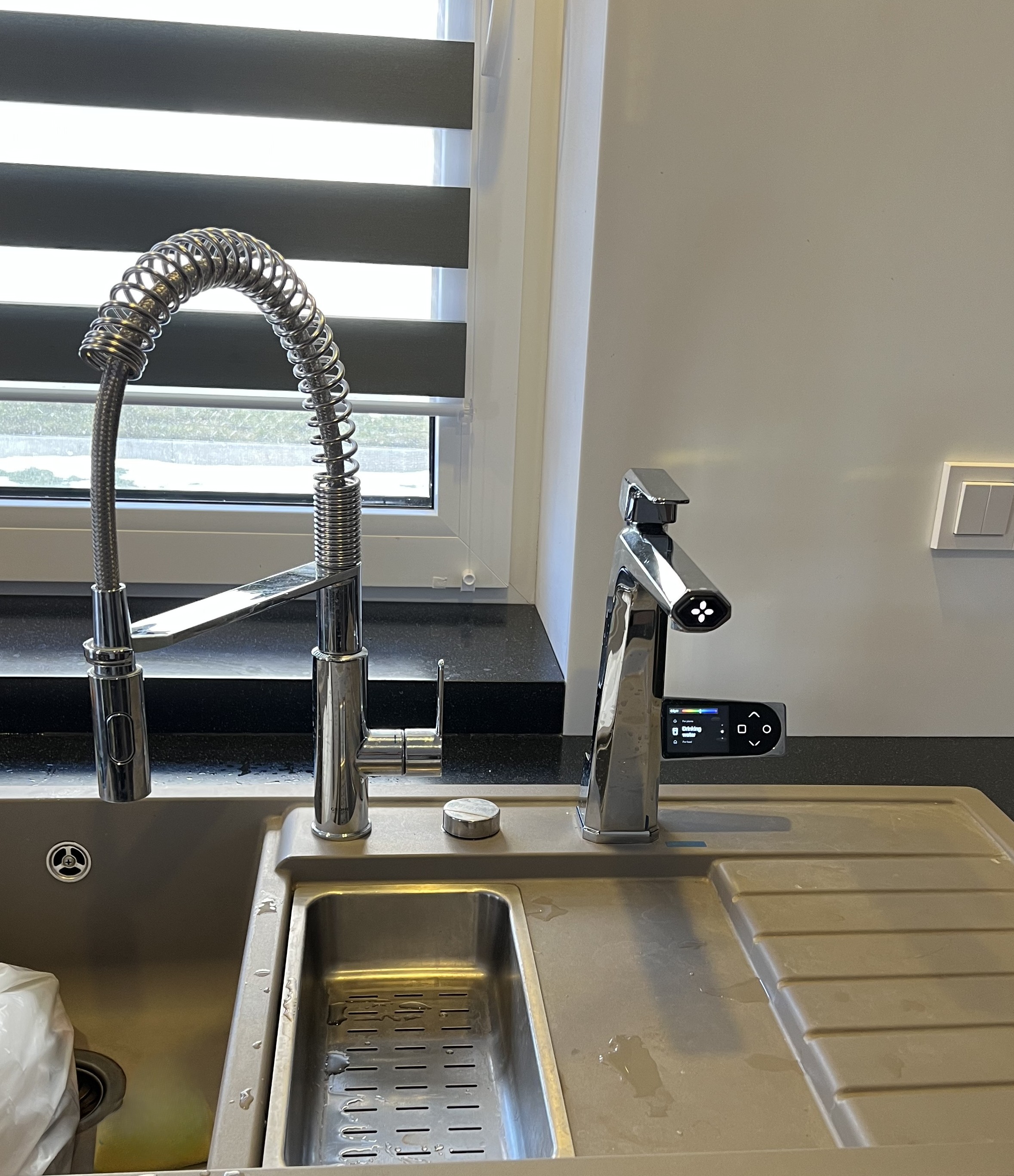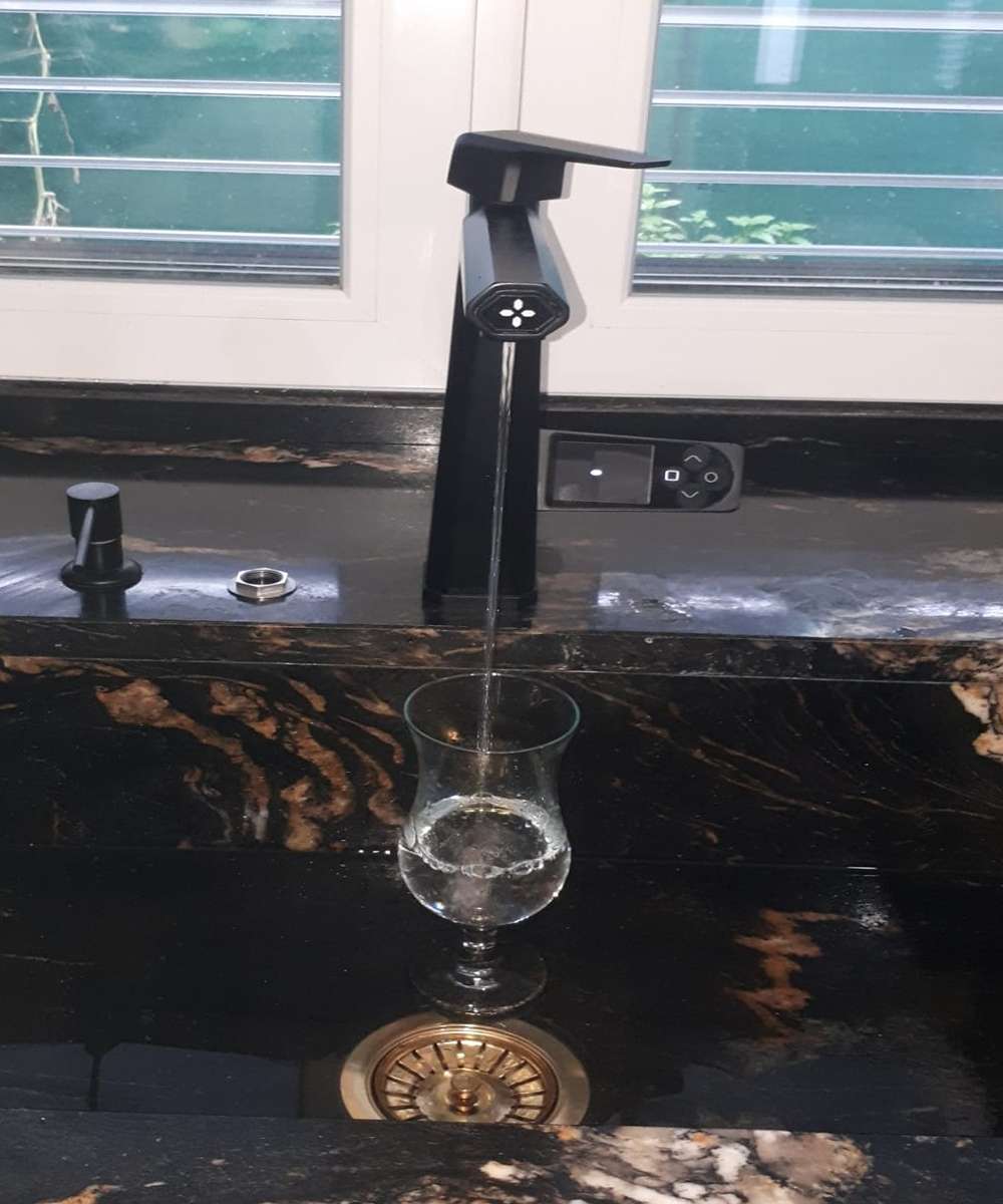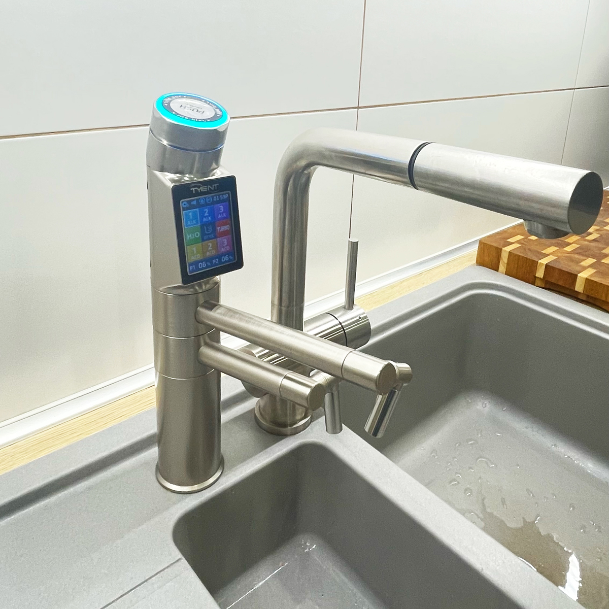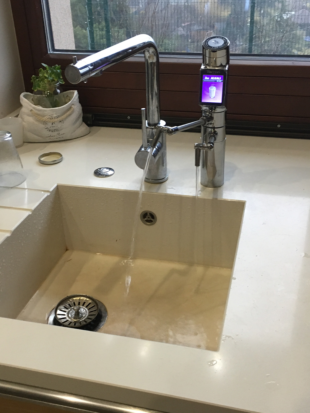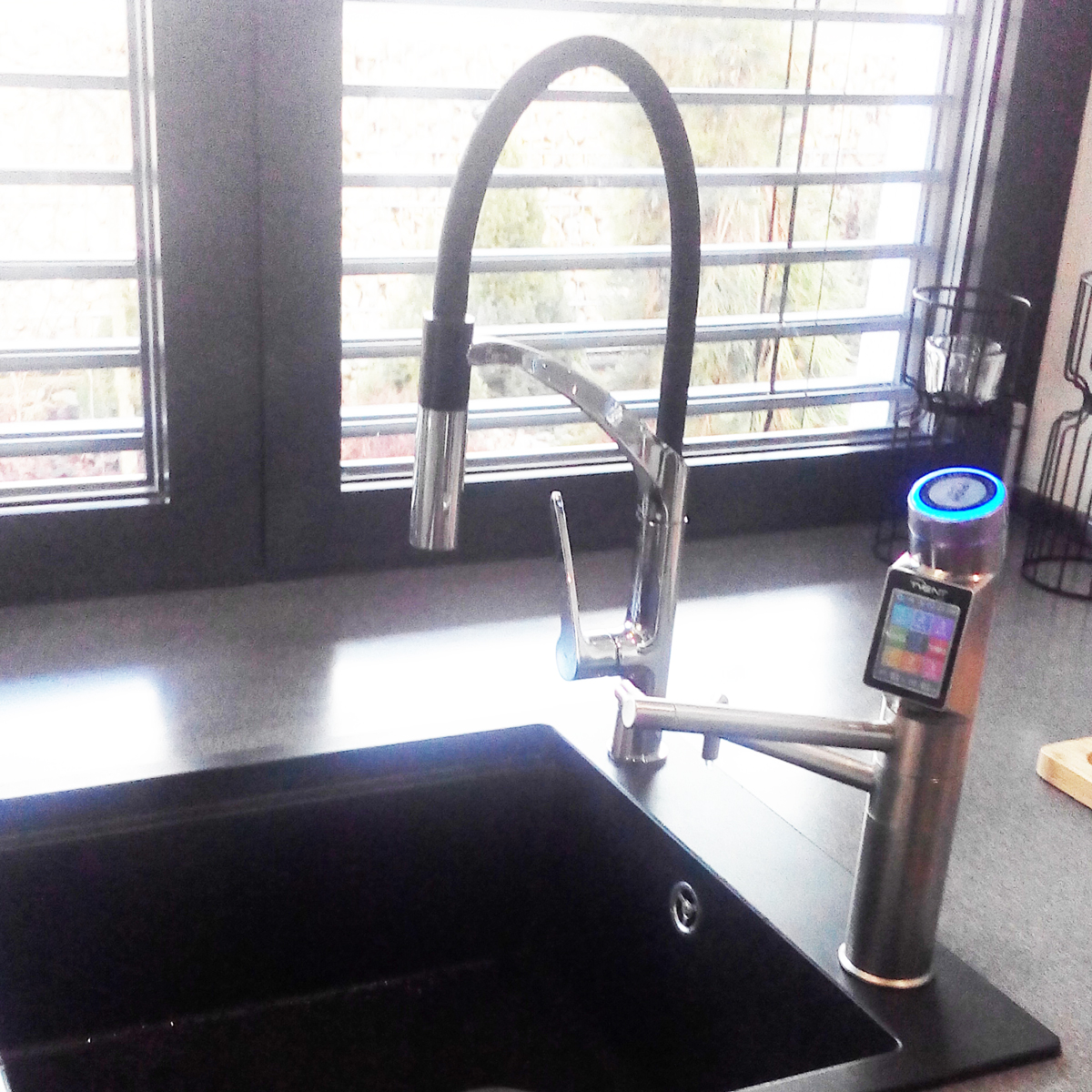 Přímo na dřezu můžete z luxusního směšovače čerpat ionizovanou alkalickou a kyselou vodu. Ionizační baterie je třícestná a plně nahradí původní kuchyňskou baterii. Z baterie vytéká teplá, studená a ionizovaná voda. Člověk nemusí mít na dřezu 2 baterie. Mobilní aplikace umožňuje ionizátor ovládat také prostřednictvím mobilního telefonu. Jednoduchý proces čištění ionizátoru v pohodlí domova zajišťuje stálý dokonalý výkon ionizátoru. Ionizátor vody k nám nemusíte posílat k vyčištění jako u jiných ionizátorů.