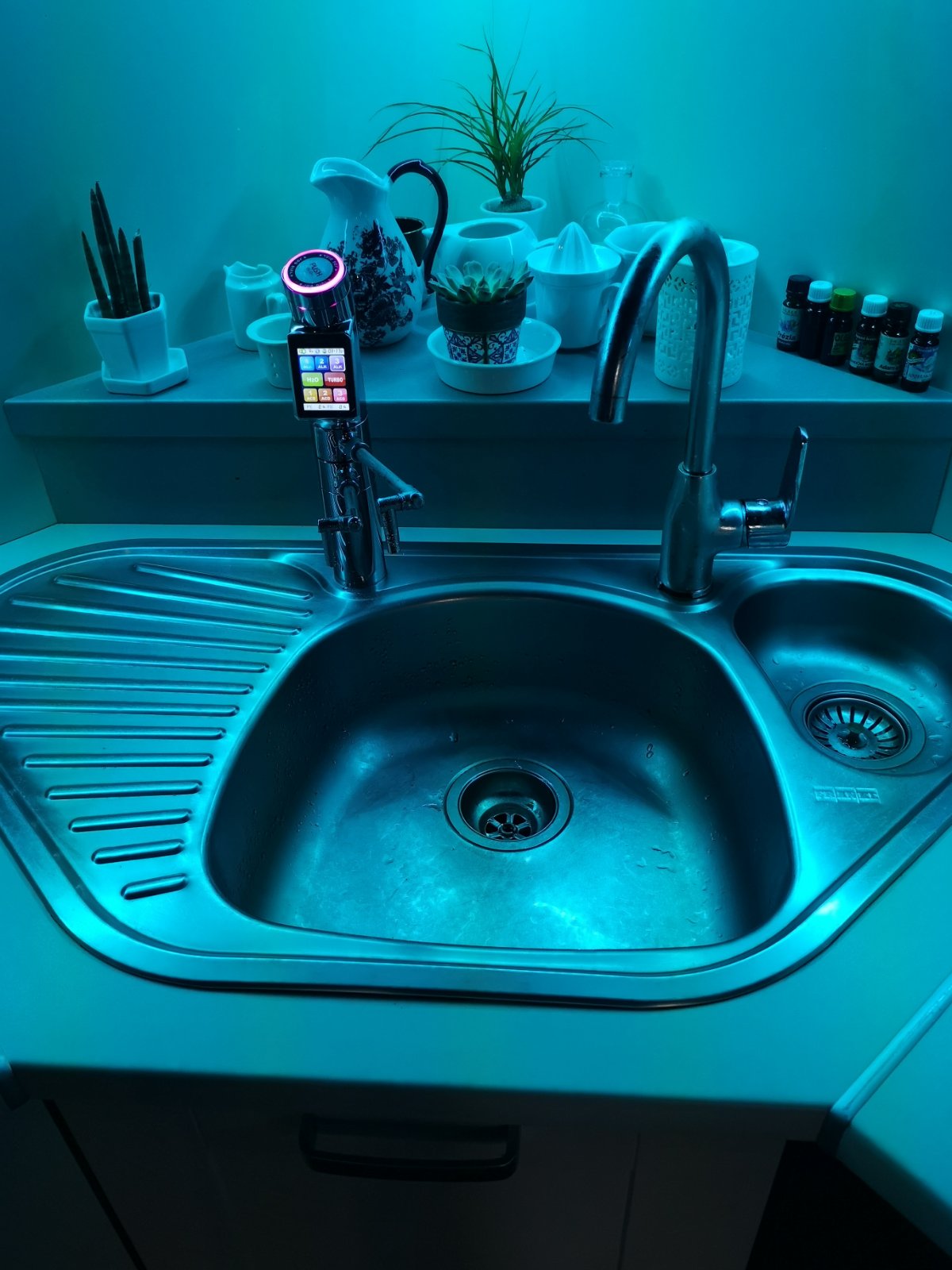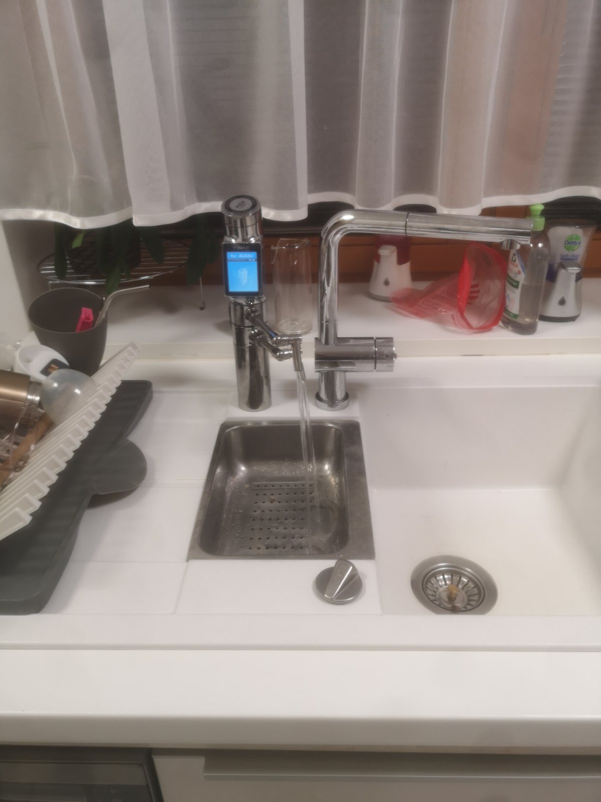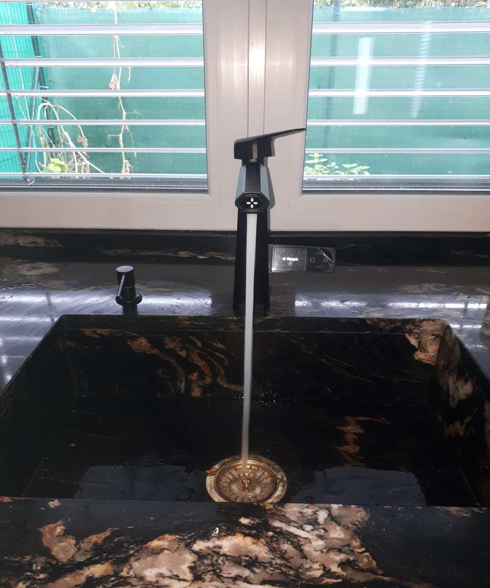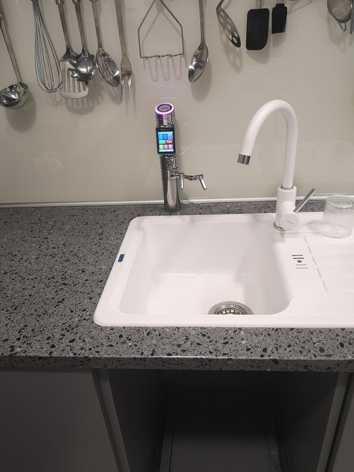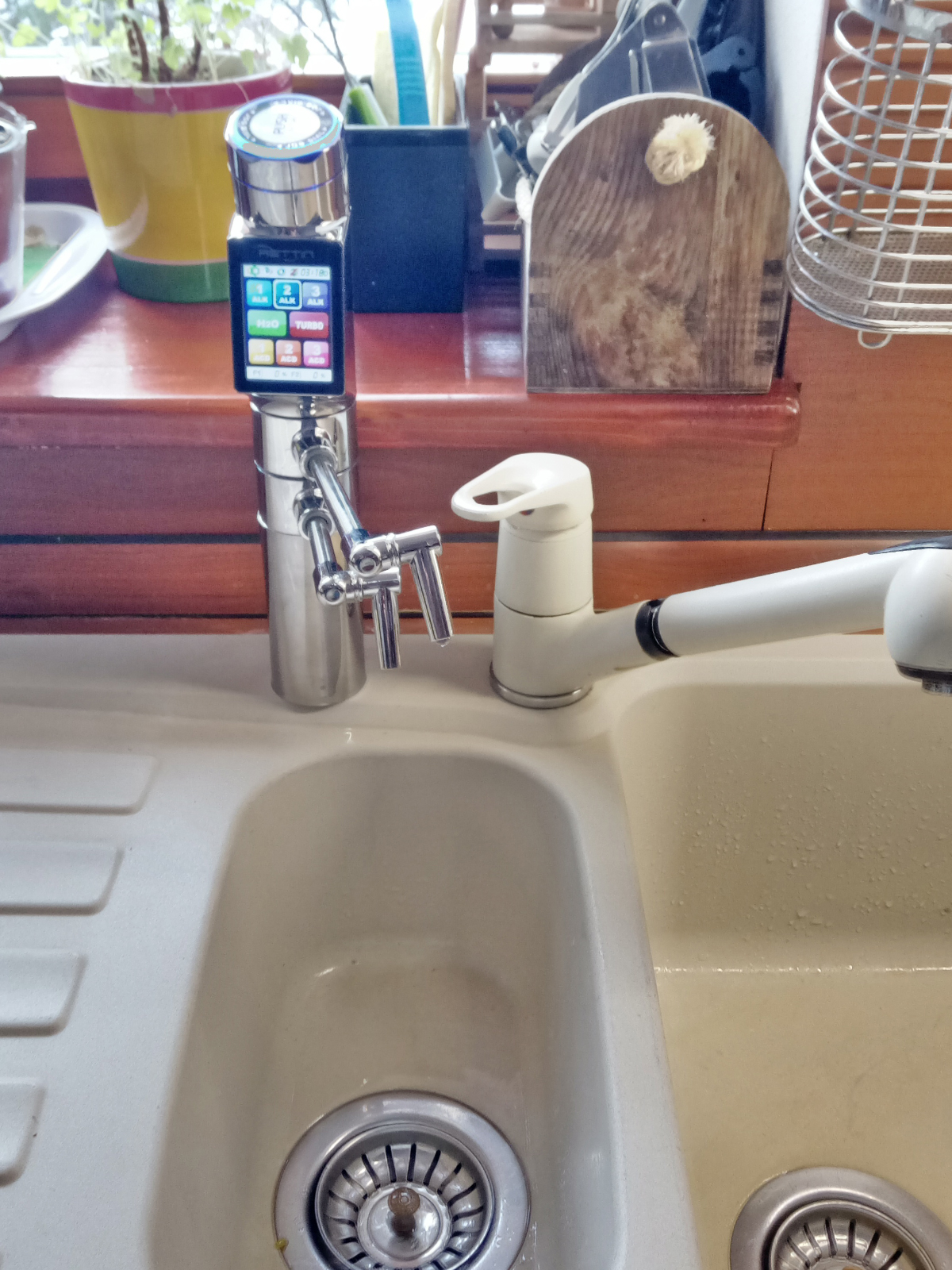 Přímo na dřezu můžete z luxusního směšovače čerpat ionizovanou alkalickou a kyselou vodu. Ionizační baterie je třícestná a plně nahradí původní kuchyňskou baterii. Z baterie vytéká teplá, studená a ionizovaná voda. Člověk nemusí mít na dřezu 2 baterie. Mobilní aplikace umožňuje ionizátor ovládat také prostřednictvím mobilního telefonu. Jednoduchý proces čištění ionizátoru v pohodlí domova zajišťuje stálý dokonalý výkon ionizátoru. Ionizátor vody k nám nemusíte posílat k vyčištění jako u jiných ionizátorů.