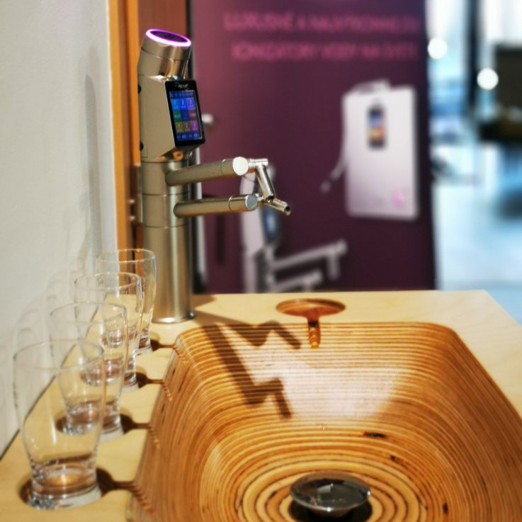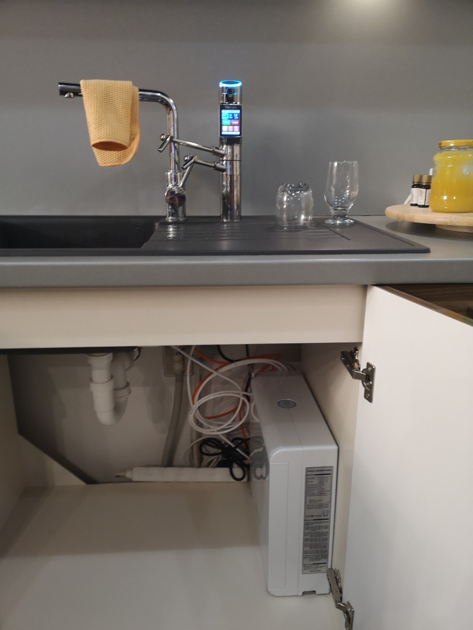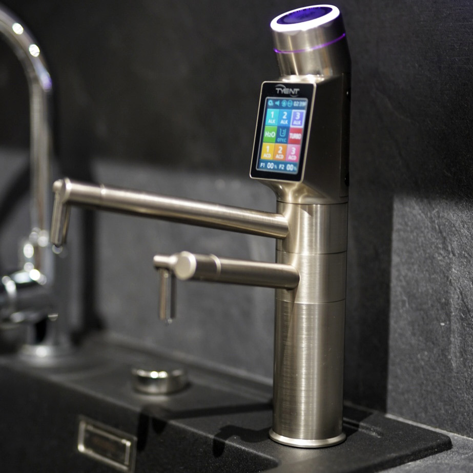 Luxusní ionizátor vodypod pult s prodlouženou pětiletou zárukou. Samotný ionizátor vody z nerezové oceli je umístěn ve skříňce pod dřezem, na dřezu je pouze elegantní nerezová baterie s dotykovým ovládacím panelem a LCD displejem.