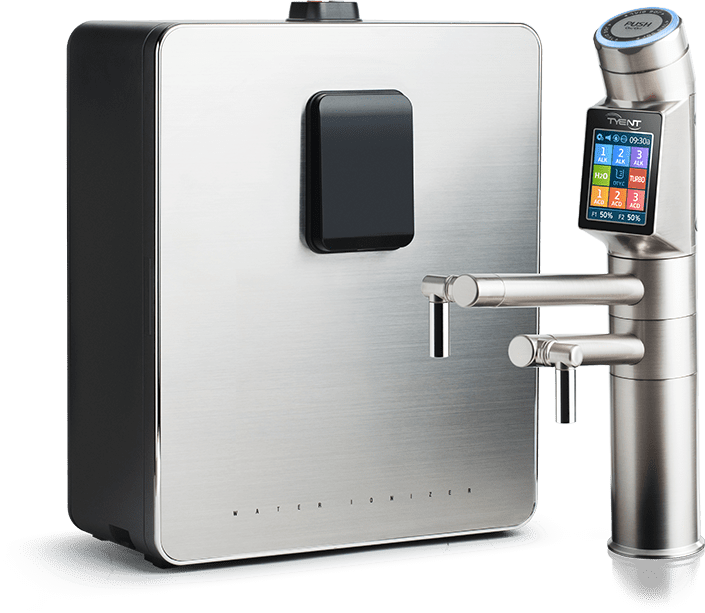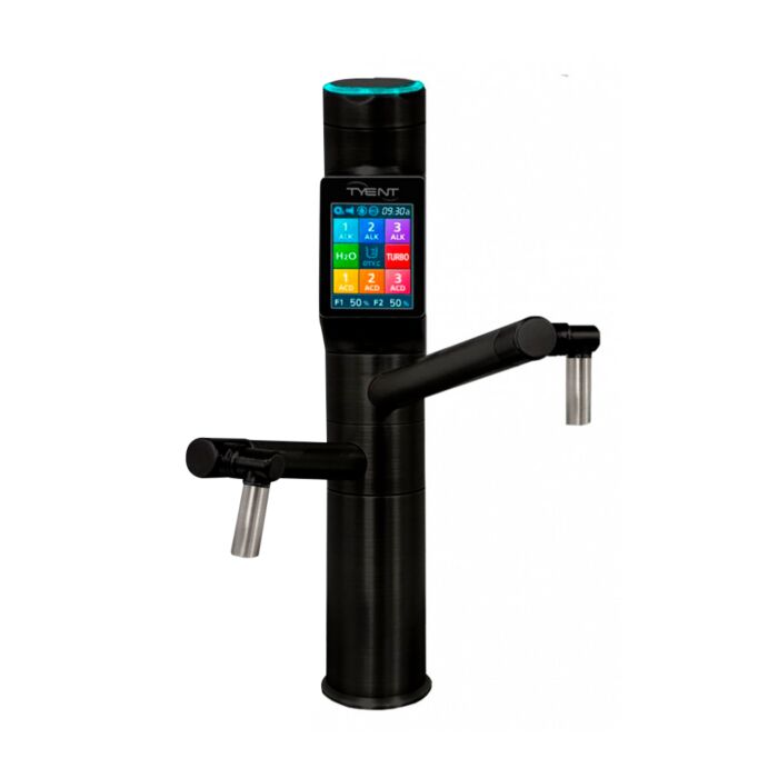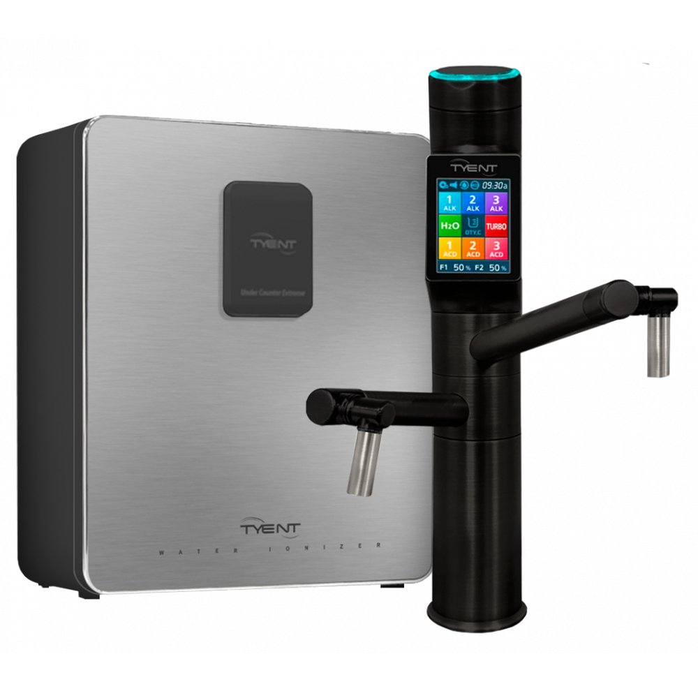 Nejprodávanější a nejvýkonnější luxusní ionizátor pod kuchyňskou linku s 13 elektrodami TYENT v černém provedení. Samotný ionizátor je umístěn ve skříňce pod dřezem, na dřezu je umístěna pouze elegantní baterie s dotykovým ovládacím panelem a LCD displejem.