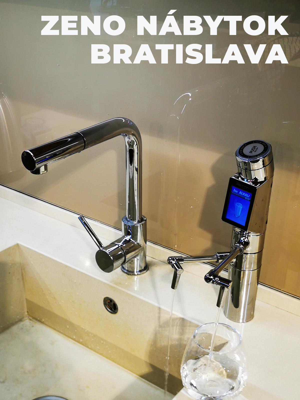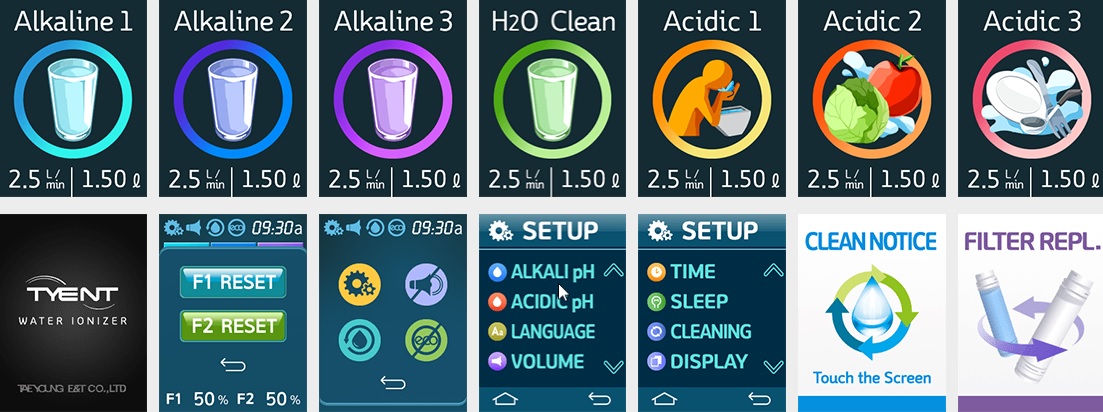 Ionizátor se ovládá pomocí dotykového panelu umístěného na baterii ionizátoru na kuchyňském dřezu. Baterie ionizátoru je vybavena LCD displejem, který zobrazuje typ vody a stupeň ionizace. Zobrazuje také životnost filtru - připomíná vám, kdy je čas filtr vyměnit. Ionizovanou alkalickou a kyselou vodu můžete nabírat přímo z baterie ve dřezu.
