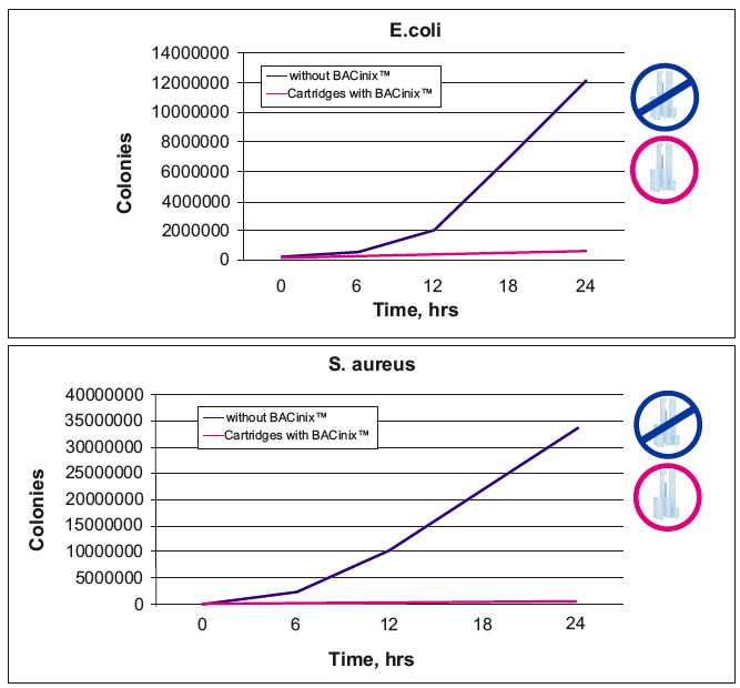 Výsledky testů ukazují, že bez technologie BACinix™ můžeme pozorovat výrazný růst bakteriálních kolonií. Naopak při použití technologie BACinix™ Nanostriebro můžeme pozorovat výrazné zpomalení růstu bakterií.